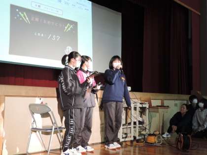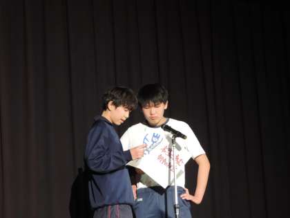3/18(火)1年生学年レク5 公開日 2025/03/20 更新日 2025/03/20 輝く朝中生! 3月18日に行われた1年生の学年レクリエーション「大円会(だいえんかい)」の様子です。ゲーム、クイズ、有志発表やスライド上映等を行い、学年全員で盛り上がりました。 1年