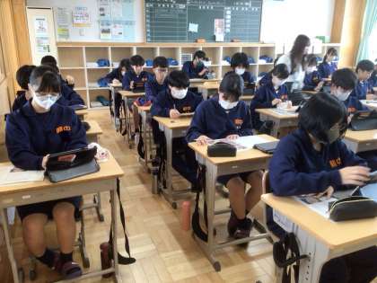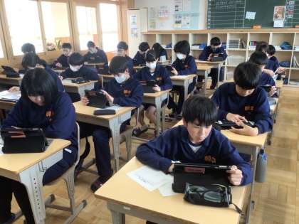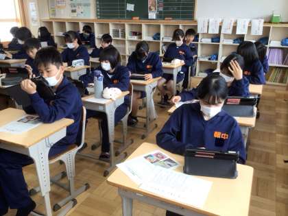 26学級です。学習用タブレットを使って、級訓のデザインを考えています。