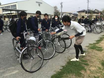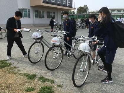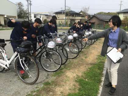 自転車安全運転講習会です。先生といっしょに自転車点検をしています。