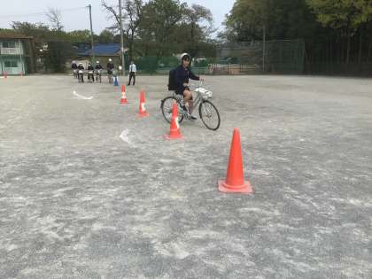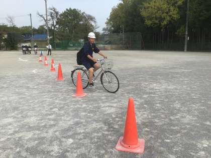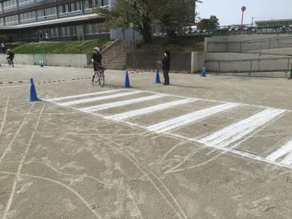4/18(金)自転車講習会7 公開日 2025/04/18 更新日 2025/04/18 輝く朝中生! 運動場では、「運転技能試験」を取り入れ、通学路を安全に登下校するためのポイントを先生といっしょに確認しています。