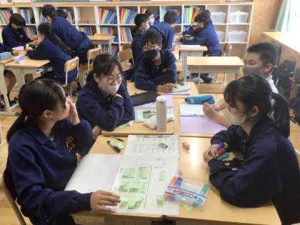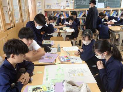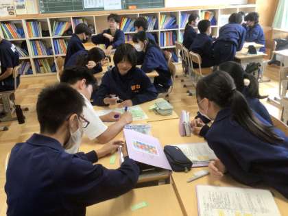 21学級の道徳です。グループ内で、付箋を使って考えを共有しています。