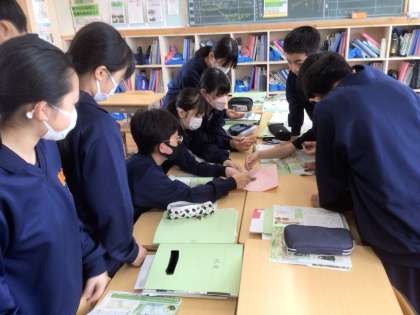 16学級の社会です。実際に縄文土器、弥生土器、須恵器を触って学習しています。