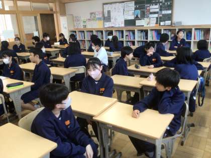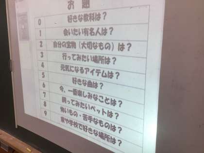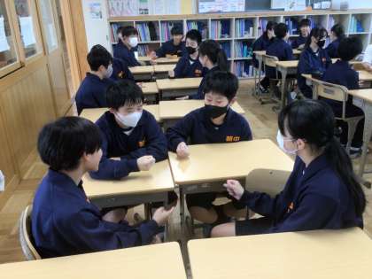 17学級の朝の短学活です。あさジャンをして、お題に沿ってグループで話しています。