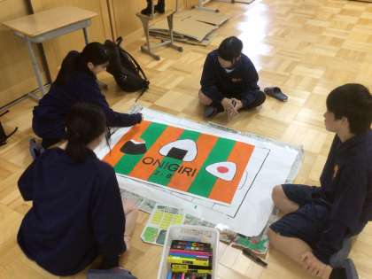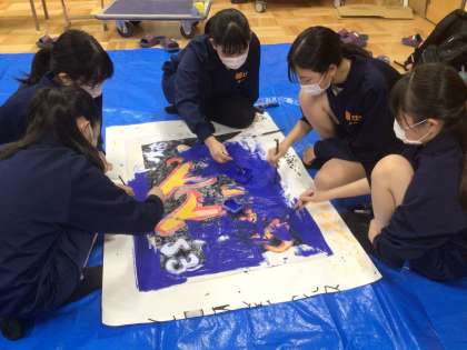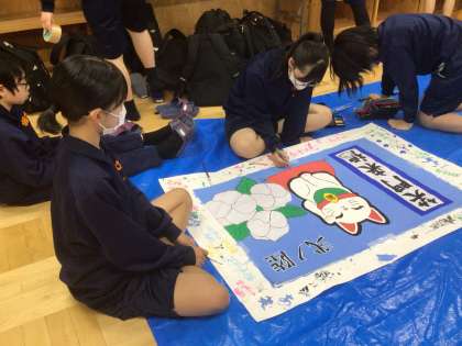2年生です。午後から各学級の担当生徒が学級旗を製作しています。完成に近づいています。