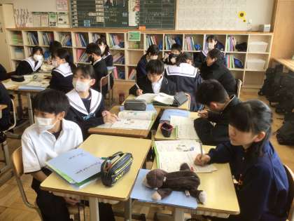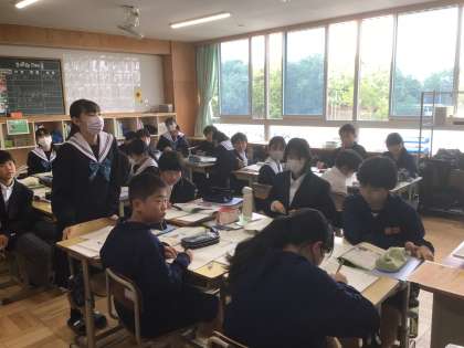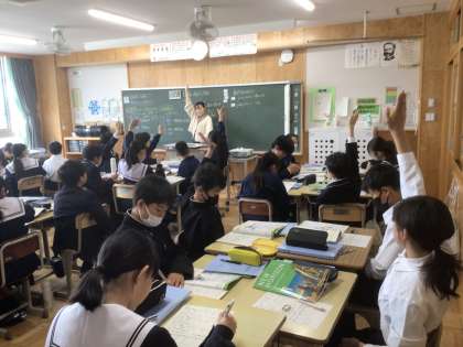 13学級の英語です。英語の動詞を発表しています。積極的に発言しています。
