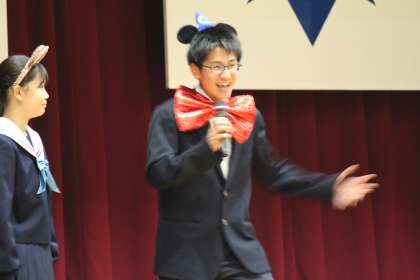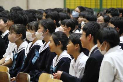 体育館では、生徒会執行部の生徒が、1年生に中学校の生活で大切にしてほしいことを伝えています。