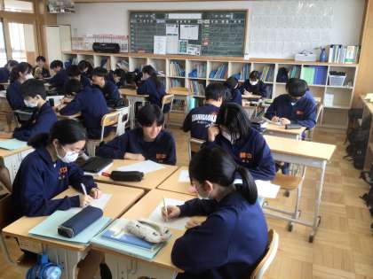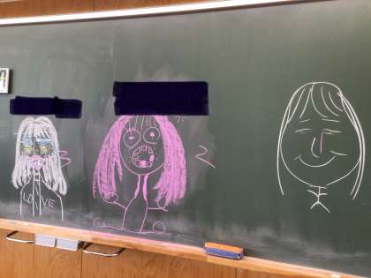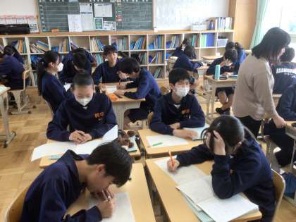 5/1(木)授業の様子1 公開日 2025/05/01 更新日 2025/05/01 輝く朝中生! 35学級の数学です。グループで計算問題に取り組んでいます。(黒板には不思議な絵が描かれています) 3年