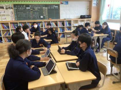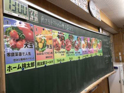 22学級の技術です。育てたい理由を伝え合いながら、トマトの品種を選んでいます。