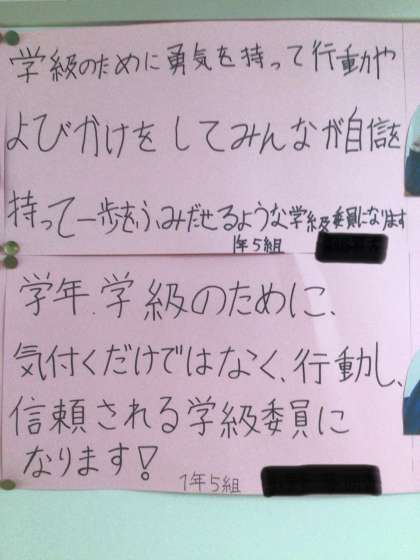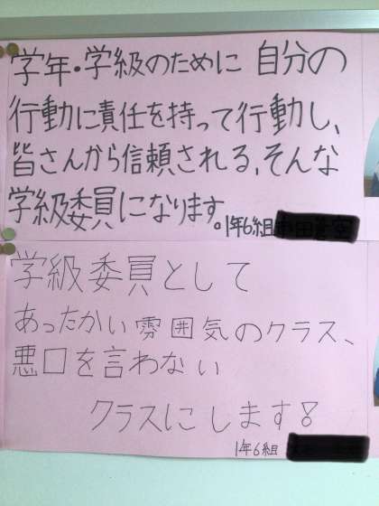 5/7(水)1年生掲示2 公開日 2025/05/07 更新日 2025/05/07 輝く朝中生! 1年生の廊下に掲示されている学級委員の決意です。学級の仲間のためにがんばろうとする気持ちが伝わってきます。 1年