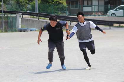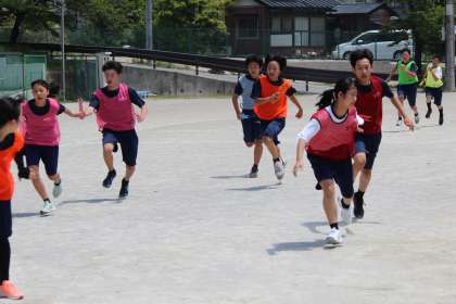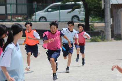 縦割り選抜リレーです。1年生から3年生の選抜生徒で1組団〜9組団のチームを組んで競います。(9組団は、1年生しかいないため、先生が助っ人で走ります。)学年を越えてバトンをつなぎます。