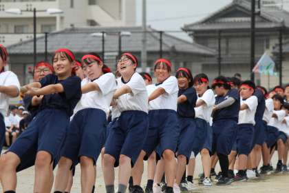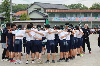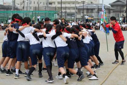 2年生の綱引きです。円陣を組んで、気持ちを入れます。