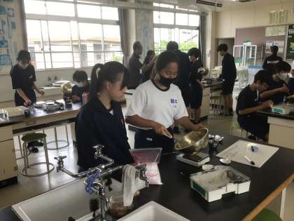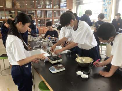 24学級の理科です。学習課題は「ホットケーキがふっくら膨らむしくみを科学的に解き明かそう」です。グループで実験をしながら探究しています。