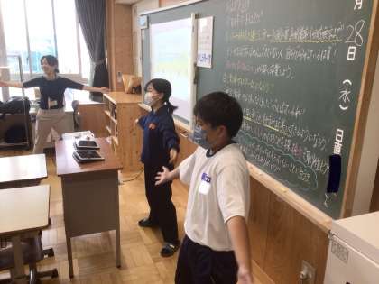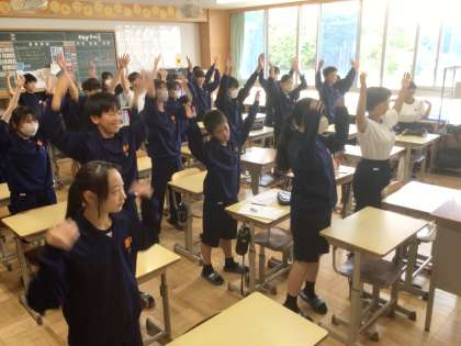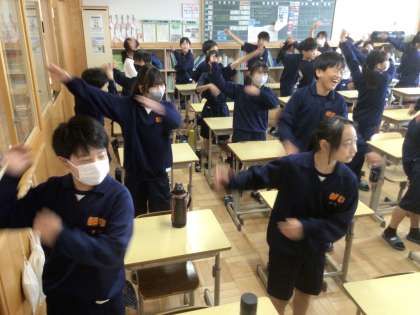 本日の朝の短学活は、体育福祉委員企画のラジオ体操です。写真は13学級です。