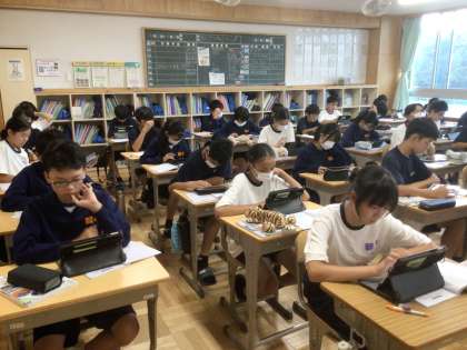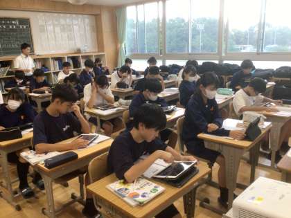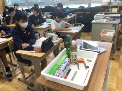 12学級の理科です。さまざまな実物を見ながら、金属と非金属の違いについて考えています。