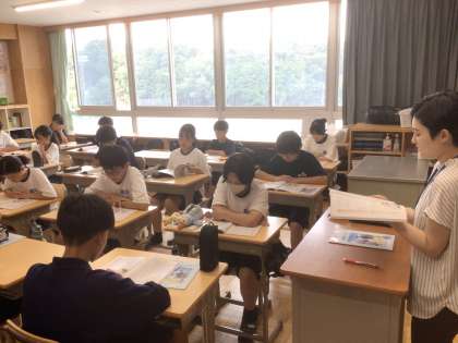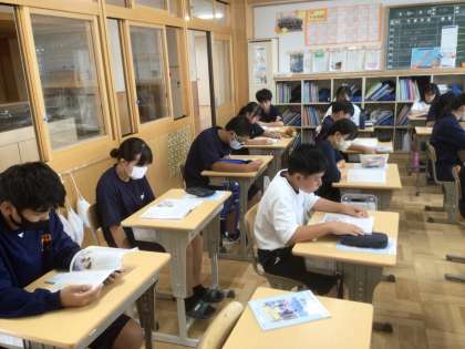18学級の道徳です。先生が読む物語をみんな真剣に聞いています。