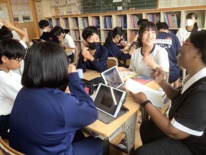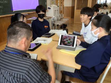 22学級です。目線を合わせて、おすすめのローカルフードの良さを伝えています。