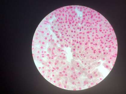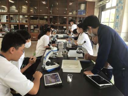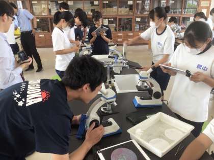 38学級の理科です。ネギの細胞分裂の様子を観察しています。学習用タブレットで撮影し、じっくり観察しています。
