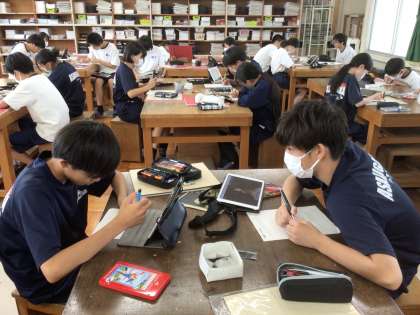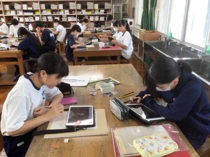 7/9(水)授業の様子2 公開日 2025/07/09 更新日 2025/07/09 輝く朝中生! 27学級の美術です。進出する色と後退する色を意識して有名な少女像に色付けをし、実物の色使いと比較しています。 2年