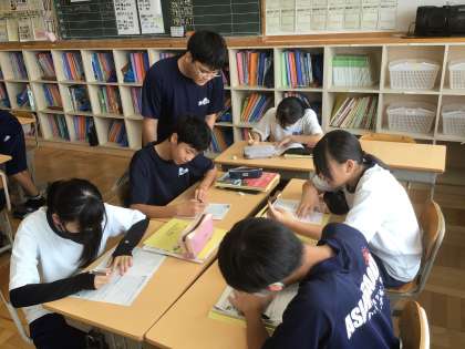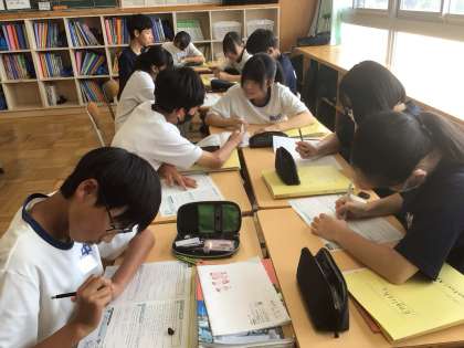 22学級の英語です。不定詞を使った英文の並べ替え問題に取り組んでいます。グループで話し合って進めています。