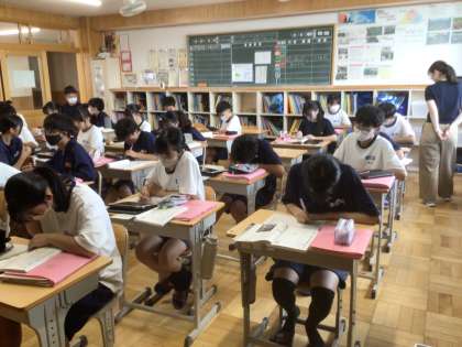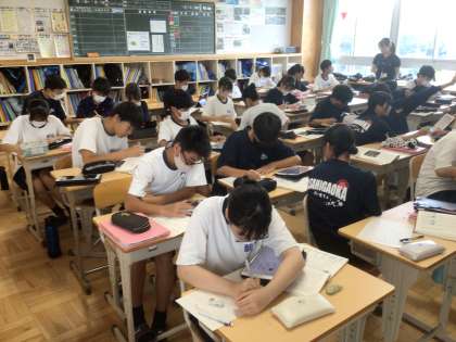 7/11(金)授業の様子3 公開日 2025/07/11 更新日 2025/07/11 輝く朝中生! 21学級の国語です。言葉の美しさを感じながら、自分の好きな言葉を見つけています。(例)「ひとりじゃないって最強だ」 2年