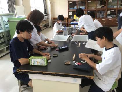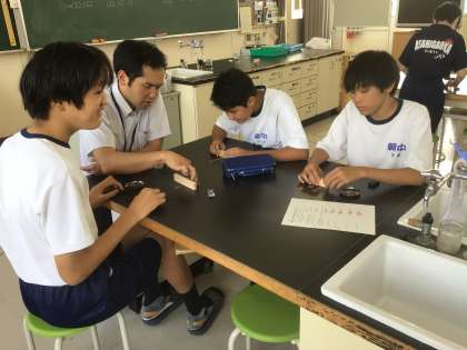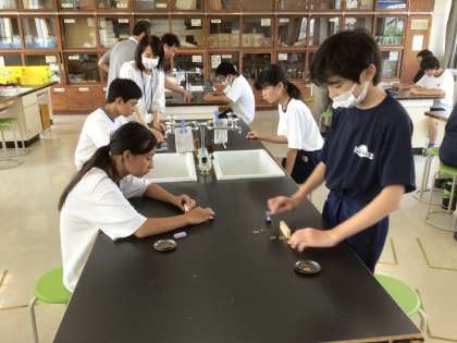 1・2・3・4・5・6学級の理科です。小銭を使って、衝突のエネルギーの伝わり方を調べています。