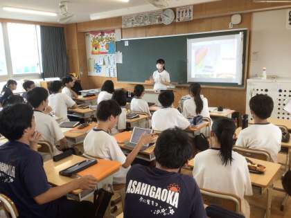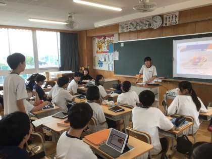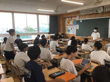 7/16(水)授業の様子1 公開日 2025/07/16 更新日 2025/07/16 輝く朝中生! 36学級の英語です。人や社会、環境を意識して作られている“ethical”な商品をテーマに英語でプレゼンしています。プレゼン後は、英語で質問する生徒もいます。Q:Have you ever eaten that? A:No,I haven’t. But I want to try it. 3年