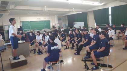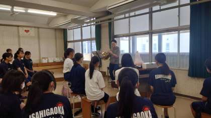 吹奏楽部です。地域指導者の方が演奏をプレゼントしてくれました。