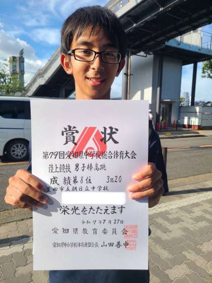 7/27(日)部活動大会結果2 公開日 2025/07/27 更新日 2025/07/27 輝く朝中生! 陸上部です。 愛知県中学校総合体育大会 男子棒高跳 8位 女子200m 8位 惜しくも東海大会出場を逃しましたが、出場者は全員健闘しました。暑い中、たくさんの応援ありがとうございました。 部活動