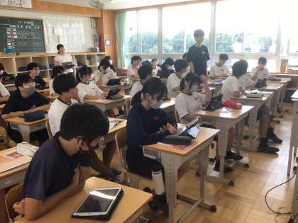 9/2(火)授業の様子3 公開日 2025/09/02 更新日 2025/09/02 輝く朝中生! 36学級の道徳です。夏に生徒が訪れた沖縄の海について、撮影した写真を共有しながら紹介しています。みんなできれいな海を未来へつないでいきましょう。 3年