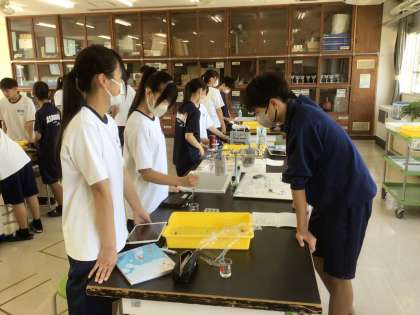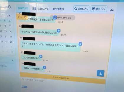 9/9(火)授業の様子2 公開日 2025/09/09 更新日 2025/09/09 輝く朝中生! 35学級の理科です。5種類の水溶液の正体を探っています。SKYMENUの「気づきメモ」を使い、実験からわかったことを共有しながら進めています。 3年