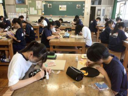 32学級の美術です。漆絵風皿に、紙を貼りながら色をつけていきます。とても集中しています。