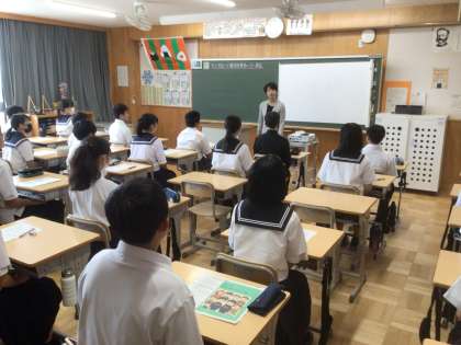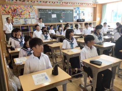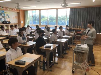本日、2年生は職場体験に向けて、講師を招いてマナー講座を開催しています。写真は28学級です。