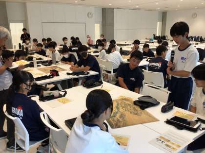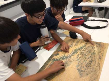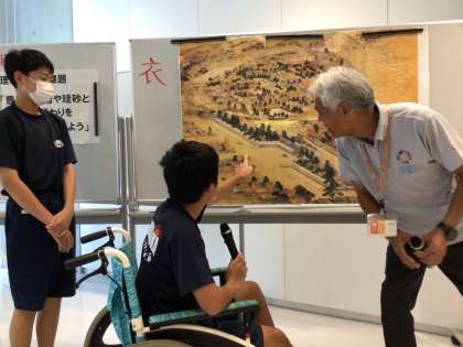 七州城図を読み取り、江戸時代の朝日丘学区の様子や人々の暮らしを想像しています。