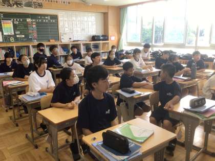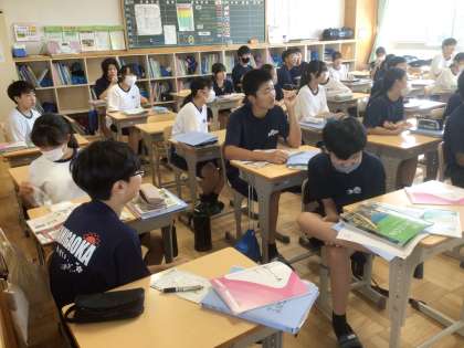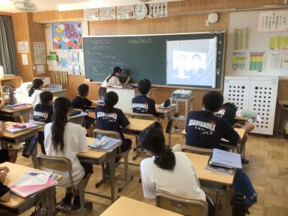 11学級の英語です。有名人を例に挙げ、代名詞の学習をしています。