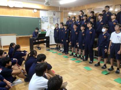 10/21(火)合唱練習2 公開日 2025/10/21 更新日 2025/10/21 輝く朝中生! 22学級「時を越えて」と12学級「カリブ夢の旅」の歌い合わせです。続いて1年生が歌います。 1年 2年