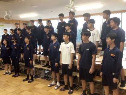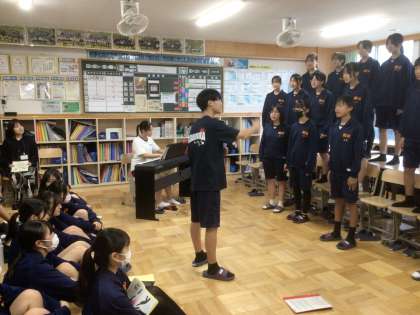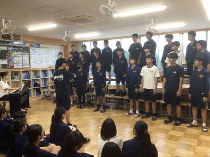 25学級の「君とみた海」です。3年生を前に歌っています。