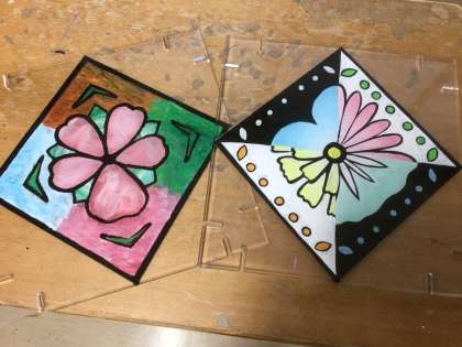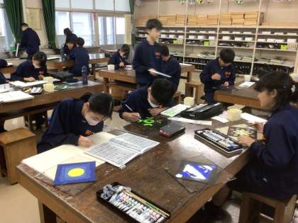 12学級の美術です。アートグラスが完成に近づいています。テーマは「自然の美しさ」です。