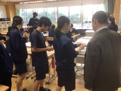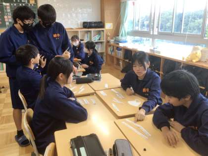 34学級の英語です。ALTの先生といっしょに、グループで後置修飾の学習をしています。