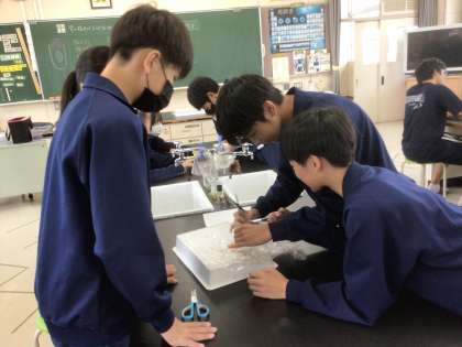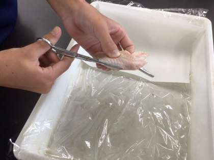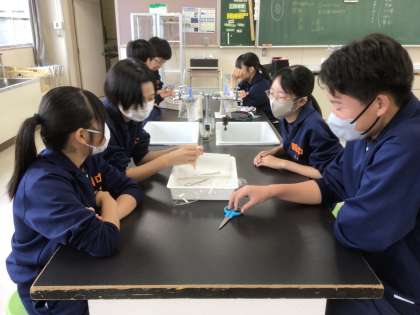 22学級の理科です。手羽先を解剖して、筋肉と骨格を観察しています。