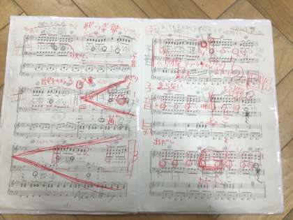指揮者の楽譜からは、これまでの努力が伝わってきます。写真は13学級です。