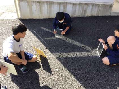 10/29(水)授業の様子2 公開日 2025/10/29 更新日 2025/10/29 輝く朝中生! 1・2・3・4・5・6学級の理科です。光の反射を利用して、光を1箇所に集めて温度がどうなるかを確認しました。反射した光をさらに反射させ、協力して三角形を描きました。(昨日の授業です) 特別支援学級