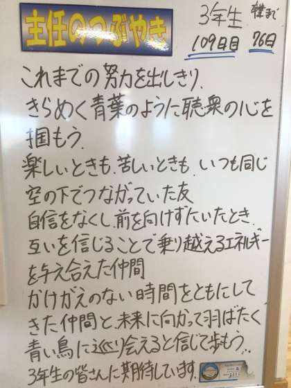 上から3年生主任と1年生主任からの学年のホワイトボードに書かれたメッセージです。