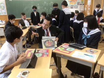 11/5(水)Try English1 公開日 2025/11/05 更新日 2025/11/05 輝く朝中生! 26学級です。市内のALTの先生が英語の授業に参加しています。おすすめの給食を紹介します。 2年