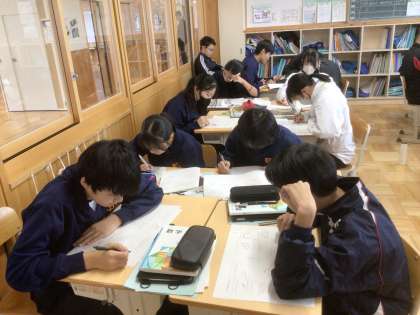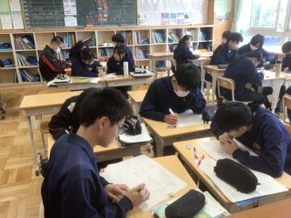 32学級の数学です。仲間と協力して図形の問題に取り組んでいます。