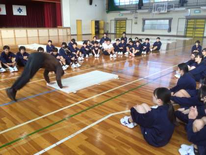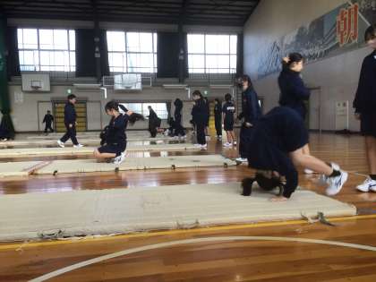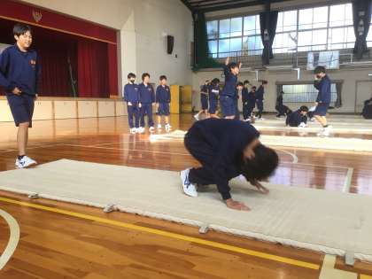 11/11(火)授業の様子5 公開日 2025/11/11 更新日 2025/11/11 輝く朝中生! 17・18学級の体育です。マット運動に取り組んでいます。教師の見本を見て、きれいな前転を目指しています。 1年