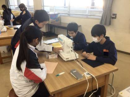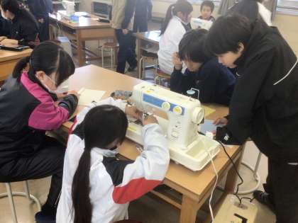 16学級の家庭科です。ポケットを作るために、ミシンを使っています。