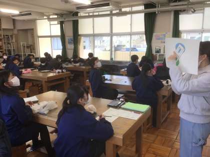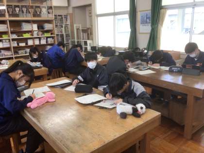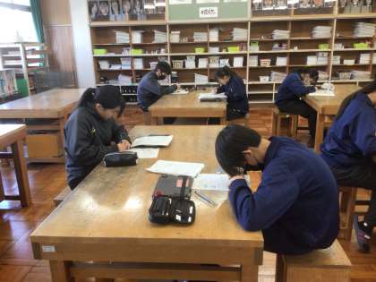 24学級の美術です。トリックアートを知るために、不思議な世界を描いています。とても集中しています。