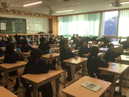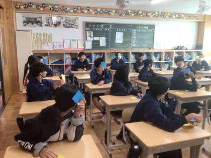 19学級です。防災に関する二者択一のお題に対して、カードを使って、YES(青)かNO(黄)の意思表示をし、話し合う防災ゲームをしています。