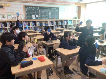 11/20(木)防災学習2 公開日 2025/11/20 更新日 2025/11/20 輝く朝中生! 18学級です。防災に関する二者択一のお題に対して、カードを使って、YES(青)かNO(黄)の意思表示をし、話し合う防災ゲームをしています。 1年