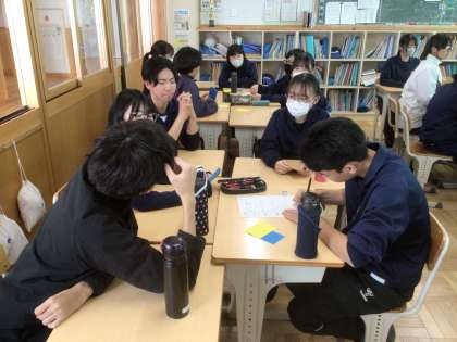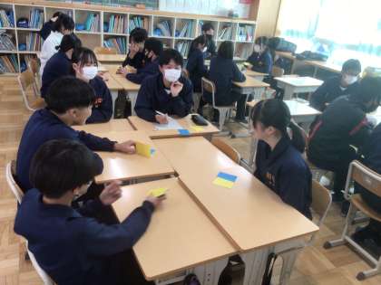 31学級です。防災に関する二者択一のお題に対して、カードを使って、YES(青)かNO(黄)の意思表示をし、話し合う防災ゲームをしています。